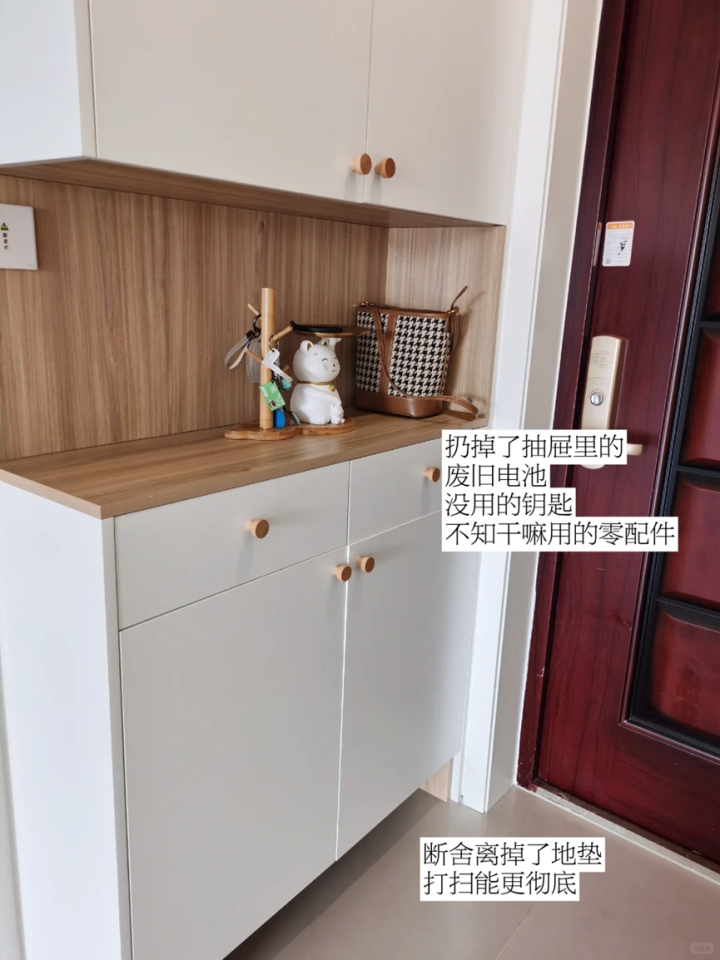 将自己和家人穿着不舒服或者是尺寸不合适的鞋子都丢掉了,整个鞋柜都变得特别干净,而且也释放出了更多的收纳空间。