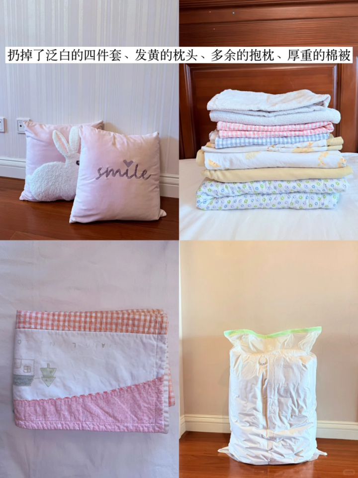 卧室除了要对衣柜进行取舍以外,大家也需要将平时用的床单被罩以及其他的一些家居用品进行一下简单的取舍,将一些已经旧的不能再用的赶紧舍弃。