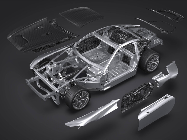 车身覆盖件则采用了混合策略,发动机舱盖、车顶等关键部位使用碳纤维增强塑料(CFRP),其余部分则为铝合金。